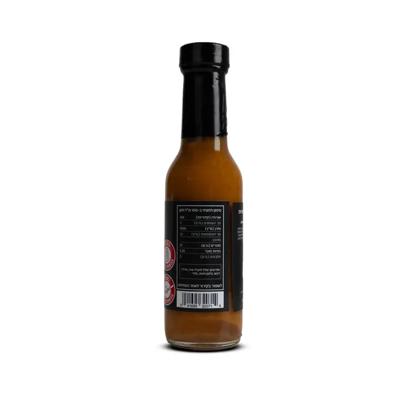 רכיבים: רוטב בטעם פלפלים 23.5%(פלפלים, חומץ, מלח), מים, סירופ אגבה, שמן מתובל בכמהין (שמן זית, תמצית כמהין,חומר טעם וריח כמהין לבן), שמן זית כתית מעולה, סוכר קנה, אבקת צ'ילי, אבקת שום, חומר טעם וריח כמהין,מסמיך( E415), מלח ים, כמון ,זרעי כוסברה.