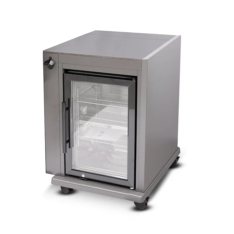 יחידת קירור איכותית למטבח החוץ שלך – הכוללת מקרר שקוף עם דלת זכוכית, תאורה פנימית ומדפים מתכווננים, נועדה לשמירה על משקאות ואוכל קריר ונגיש בזמן האירוח.