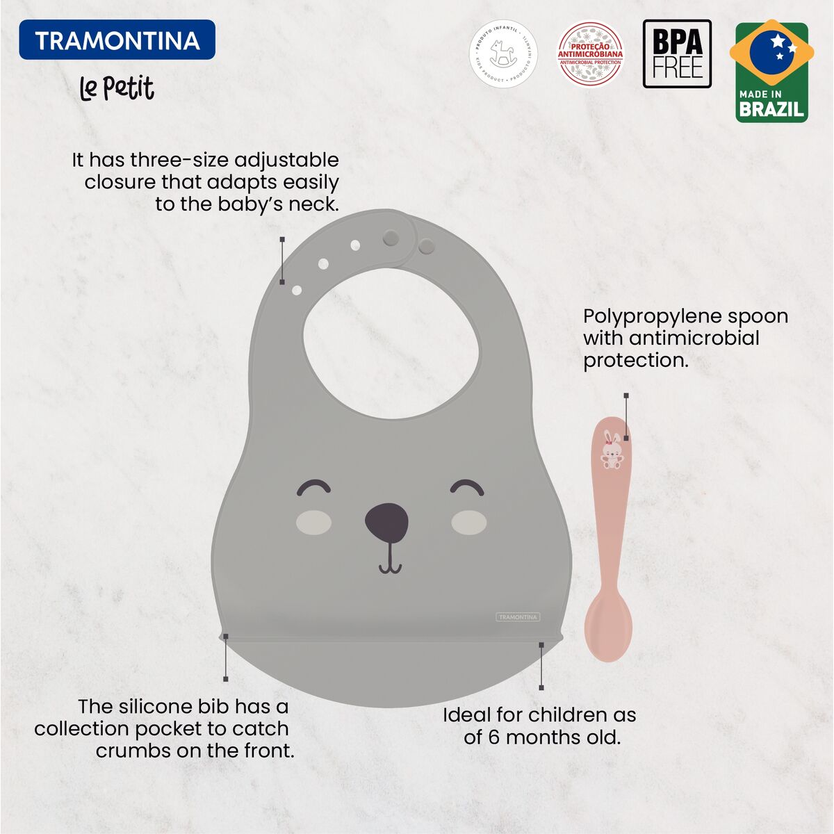 סט מושלם לליווי כל ארוחה של התינוק וכולל סינר סיליקון עם סגירה מתכווננת וכיס קדמי לאיסוף שאריות, המסייע לשמור על בגדי הילדים נקיים באמצעות לכידת פירורים.